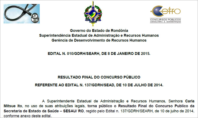 O Governo de Rondônia divulgou nesta quinta-feira o resultado final do último concurso para a Secretaria de Estado da Saúde para provimento de 266 vagas nos níveis fundamental, médio ou superior. As remunerações oscilam entre R$ 1.253,29 a R$ 11.789,24 de acordo com cargo.